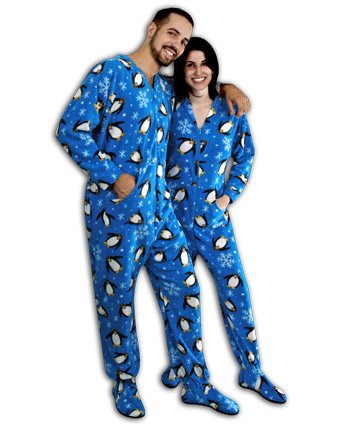 PajamaCity Blue Penguins Print Polar Fleece Drop Seat Footed Pajamas For Teens And Adults Size 5 (5'6" To 5'7")