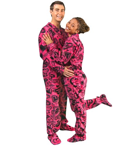 PajamaCity Pink Graffiti Hearts Print Polar Fleece Drop Seat Footie Pajamas for Teens and Adults Size 3 (5'0" to 5'3")